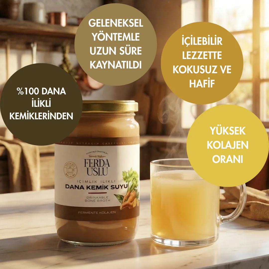 It is produced by boiling calf marrowbones over low heat for long hours. During boiling, the bone marrow melts and mixes with the bone broth. The layer on the jar is the fat of the bone marrow. Its consumption with fat is recommended. It has the purity and taste that can be drunk in the glass.
