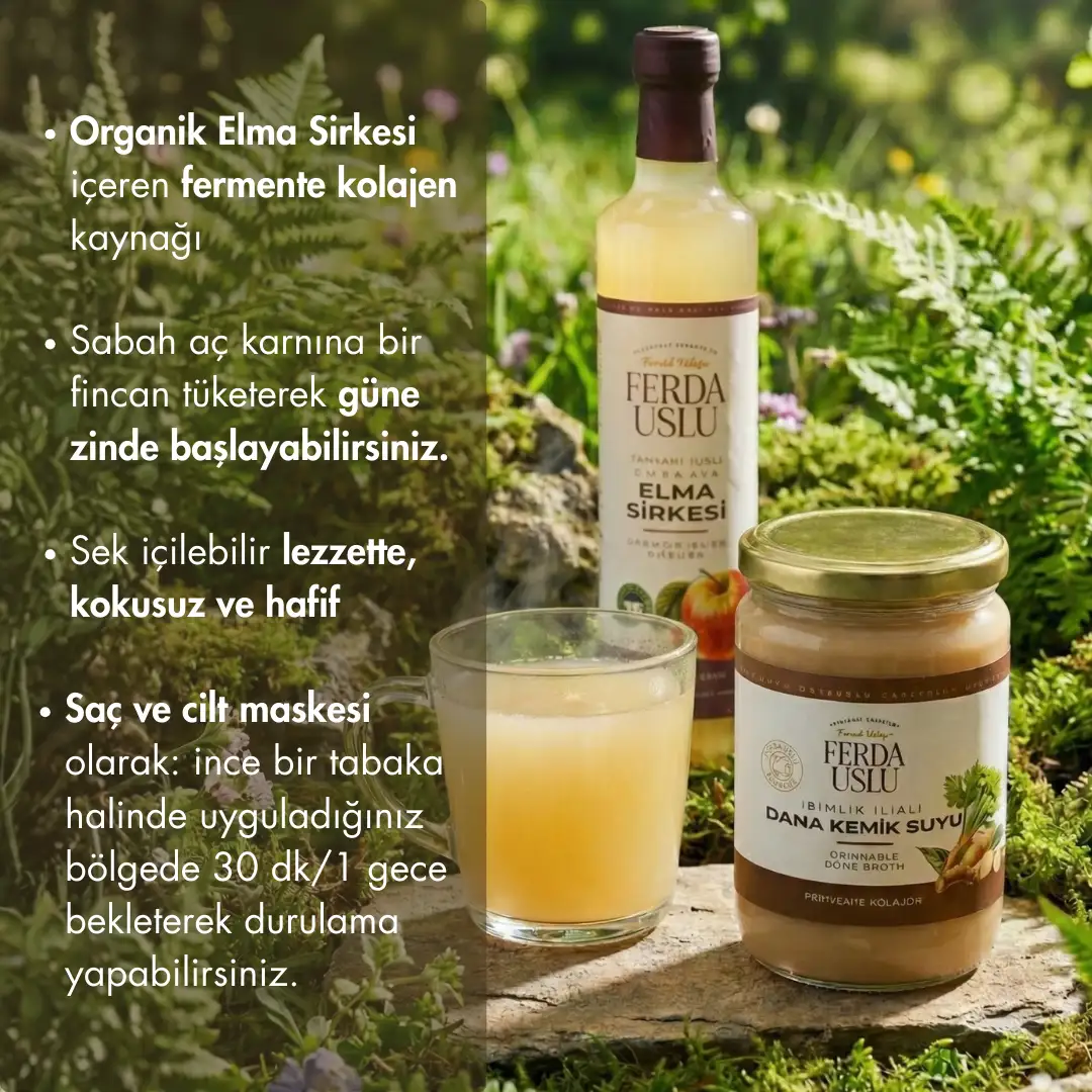 • Fermente Mutfağım Organic Apple Cider Vinegar is added into a warmed glass of bone broth and drunk.